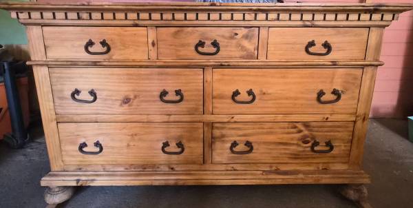 Solid pine 7 drawer low boy dresser with a natural finish in excellent condition barely used. Moving and do not need in new home. Looking for $400 obo. Dimensions 59 1/2" L x 19"D x 34 1/4"H