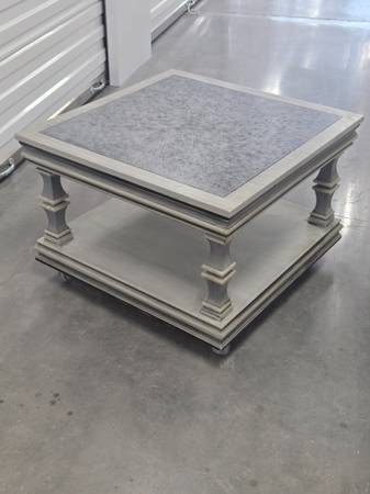 This is a custom finished table with artwork by an unknown designer. Faux finished top to resemble stonework. Nice grey with darker grey and black accents. On casters, rolls easily to any location.