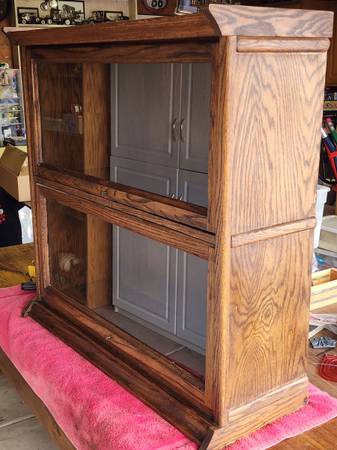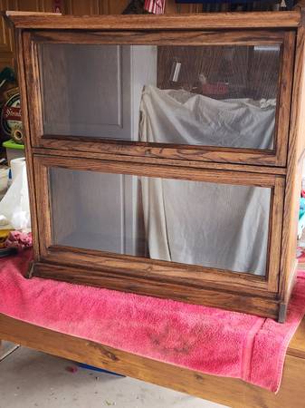 36" long x 36" tall x 11" deep. Oak wood frame. Cosmetically clean with minor scratches. Cleaned and waxed. Smoke free home. 1 door slide has been repaired in the past, slides nicely.