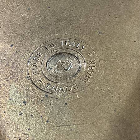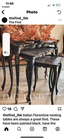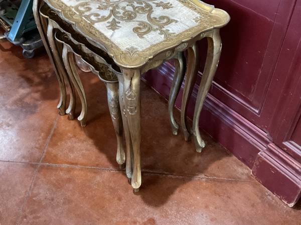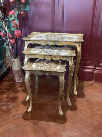 Lovely set of 3 vintage gold nesting Florentine tables. Made in Italy. These are made of a plastic resin which was all the rage in the 50’s. Very good to excellent shape. Legs are sturdy and there is no damage. Measurements: large 21-1/2” w x 13-3/4” d, 22-1/4” ht. Medium 16-3/4” wide x 12-1/2” deep, 19-1/2” ht. Small 12-1/2” x 12-1/2”. 16-3/4” ht.