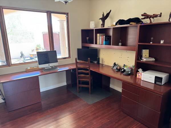 Corner desk setup from a New York City financial firm . I’ve had this since 2013. Looks like a built in. It appears to be made of wood product with a heavy duty wood laminate. It’s solid. I can stand on the desk surfaces. It does but show some wear, as seen in pictures, that can be touched up.
