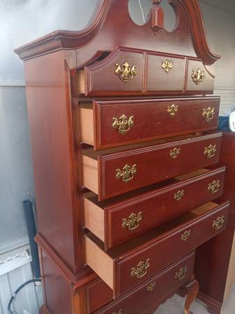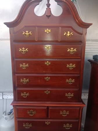 Beautiful Cherrywood tall dresser. Top comes off easily, all drawers slide out easily, good condition. 79 inches tall, 3 ft wide, 18 in deep. 5 big drawers plus 4 smaller ones. Regular wear, still...