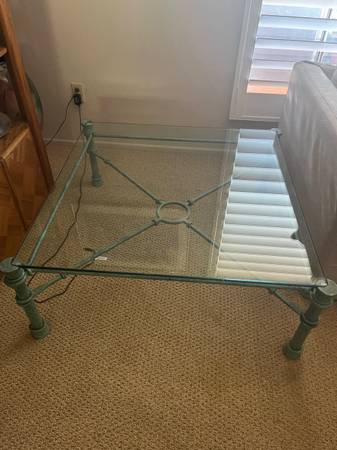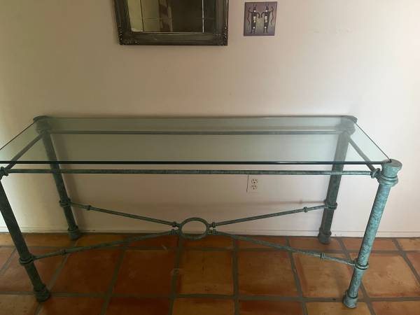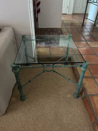Verde finish wrought iron tables. Rectangle console, square coffee & end tables. Very good condition. Heavy.