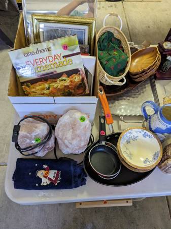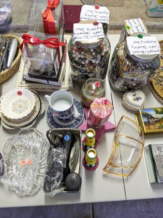 Household items, tools, ceramics, plates/bowls, glassware, costume jewelry, crafting supplies, suitcases, purses, collectibles, portable air conditioner/ heaters, ect...