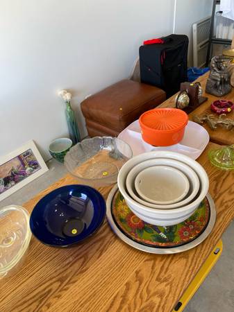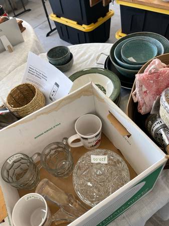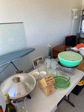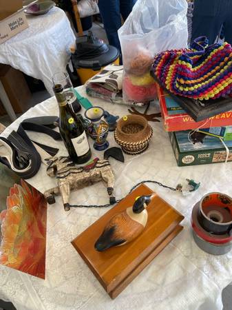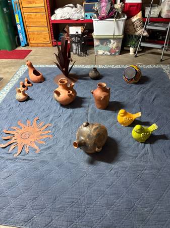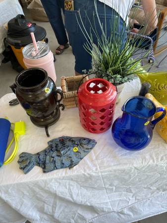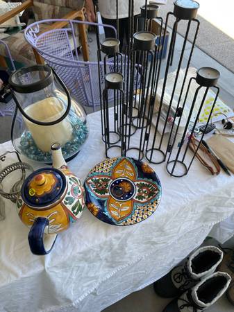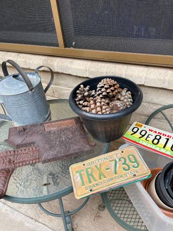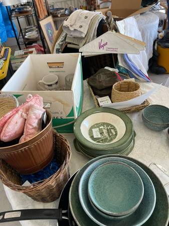 Something for almost everyone! SW garden art, kitchen, adult clothes/shoes, pottery, books, artwork, shop vac, wrought iron patio chaise chairs,