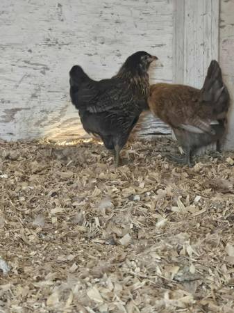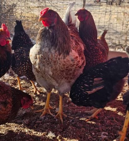 CURRENT LIST! 1 speckled susux hen 20$ 2 Americana hens feathered not laying 10$ 2 Wyandotte hens $20 each 1 peacock pied with a white mom and his dad's genetics have purple and opal $100 3 bantam...