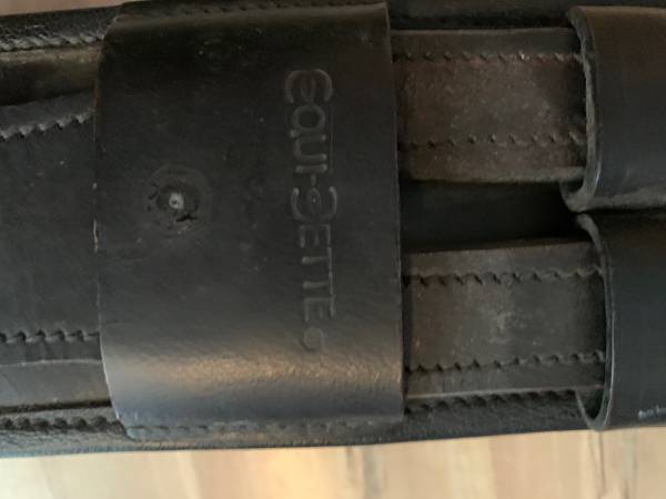 We have a Equi-Bette English girth for sale. Girth is all leather with padded underside (Softy). It has elastic on the outer side. Measured buckle end to buckle end approx 26". Color is black. Very nice lightly used condition.