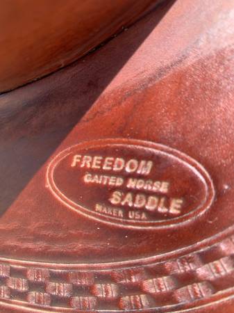 We have a very nice western saddle made by and marked FREEDOM. Saddle has serial number on bottom skirt. Dark oil leather. Seat is very deep and measures 15". Leather is very supple and high quality. All brass hardware. Stirrup leather/fender are professionally turned. Stirrups are both on one side in pictures. Saddle was just cleaned by owner.