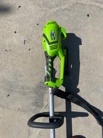 This is the Greenworks electric trimmer model #21142. It is a corded version which is great for smaller areas and when you'd rather not worry about keeping a battery charged. It was used a handful of times before we removed our grass, and is in great condition.