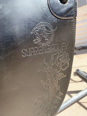We have a very nice used Australian Saddle for sale. This is made by and marked Australian Stock Saddle Co. Supreme Poley This is an original (not a knock off) This has the medallion with the Kangaroo on the pommel. Color is Black. Leather is in great condition. Comes complete with Irons, Leathers, Pad and Girth. Seat measured front of tree to cantle edge 18". This is equal to a 16" seat in a western saddle.