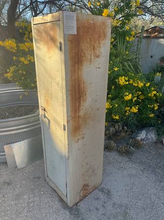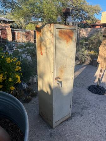 Great metal storage locker with latching handle and clasp for lock. Outdoor or garage storage. 18w x 18d x 66h