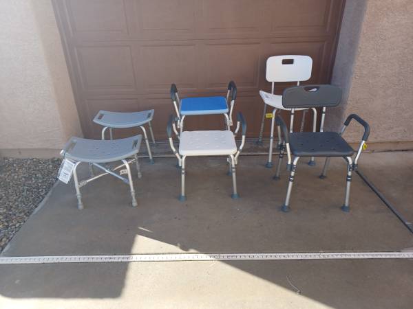 Rollators, Knee scooters, Transport wheelchairs, walkers, shower chairs, shower benches, Raised toilet seats, and commodes from $15-$150. Many mobility assist devices to choose from and all are new.