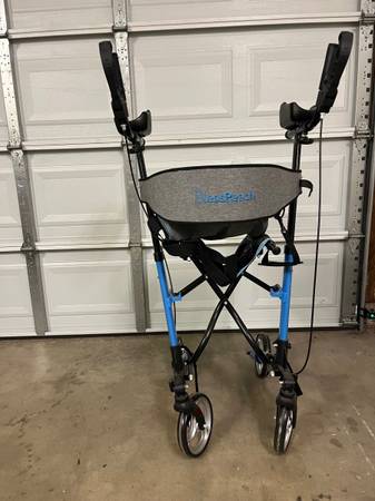 Upright bless reach walker. Hand brakes on both handles. Accessory bag. Padded seat. 300 pound weight limit. This upright walker allows you to walk upright instead of bent over like regular walkers. This type of walker is not covered by insurance. I have used this walker twice. Meet up delivery is OK.