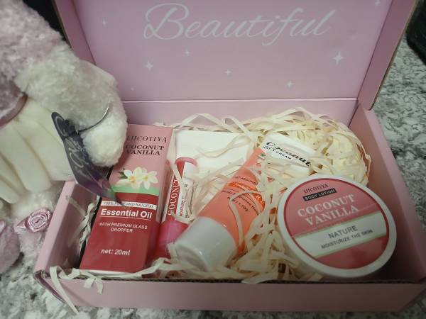 But together by me. All items in box are seal(Never opened). See all pictues. Coconut Vanilla lotions, oils and chapstick. Bag purse included in gift box. Teddy bear was added. He is also new. Great...