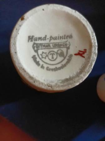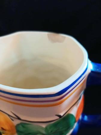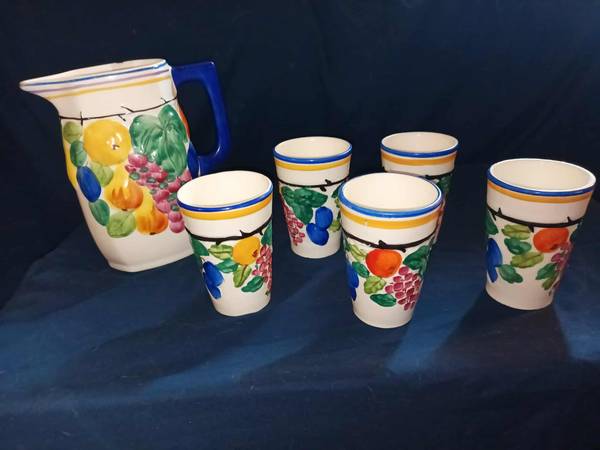 A set of 5 fruit themed cups and matching pitcher, good condition, minor chip on the rim of the pitcher