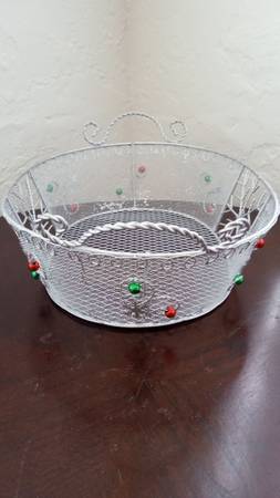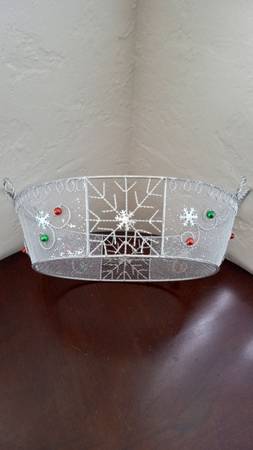 Decorative Christmas Metal Basket. Measures almost 11"L x 31/4"H, in good condition $3.00 call if no answer please leave a message Thank you.