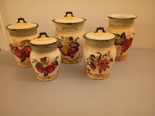 Set of 4 Certified International Pamela Gladding Decorative Ceramic Canisters and Utensil Holder. Beautiful ceramic canisters and utensil holder with fruit designs. Text Jerry @ five20-668-7957.