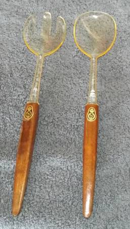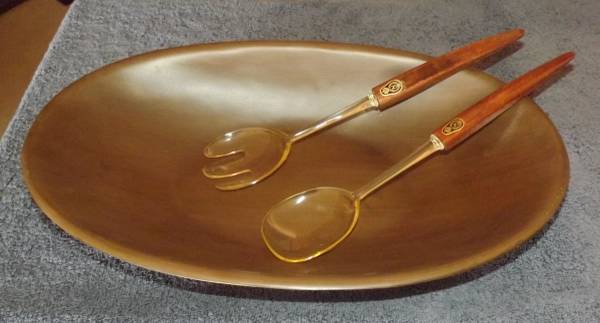 New Masterpiece in Wood Salad Bowl Set - $15 Large walnut with utensils Approximate bowl dimensions - 19 1/2" long X 11 3/4" wide X 3" deep