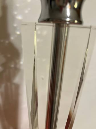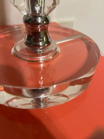 Two small defects. Last two pics, one shows chip at the base of the lamp and the last one shows a tiny dent in the main part of the lamp. Video shows marks and comparison to a normal size lamp (not for sale). Marks barely noticeable and if you turn the damaged area to the back they won’t be seen. This originally had a large black cylinder shade that broke.