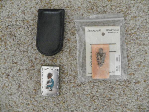 I bought these years past on our many RV trips. They are all new. The dark brown is a leather magnetic close clip. I have no use for these currently so therefore they are for sale. $10.00 each for money clips, checkbook covers or wallets.