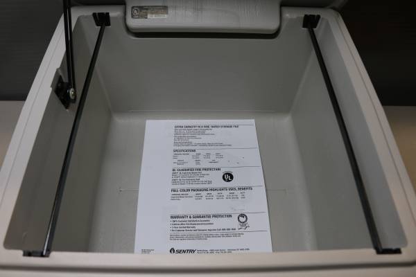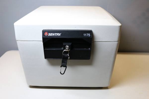 A Sentry model 1175 home safe. This safe is referred to as a ‘Jumbo Security Fire File’. Its large 1.29 cubic foot size will accommodate hanging files for important papers, and it has hanger bars for this purpose. Also useful for storage of other precious items including flash drives, DVDs, or CDs, jewelry, photographs, and more. It is constructed of plastic and has a half-hour fire Underwriters Laboratories safety rating. Two keys are included.