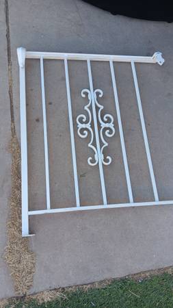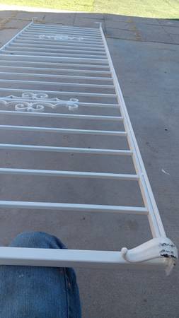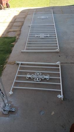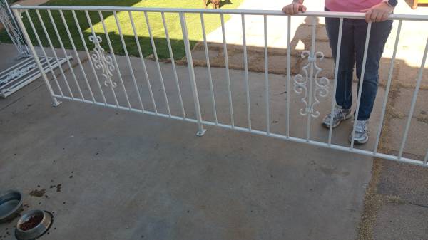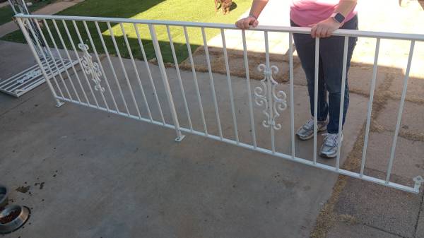 Wrought iron railing Big piece is 10 ft long, smaller piece is 2.5 ft long. Height is 33 inches, very solid, not hollow. It has designs on top area.