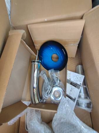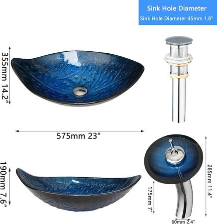 Washly 23"x14" Blue Bathroom Vessel Sink, Leaf Shape Tempered Glass Sinks And Faucet Combo, Washing Basin Bowl Waterfall Chrome Brass Pop Up Drain. Was $130 asking $70.