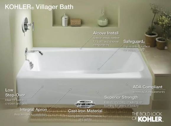 Brand new, never used, Kohler Villager cast iron bathtub (right-hand drain), in white ADA compliant Has never even been installed (...we changed our minds so now just want to sell it) ...Kohler...
