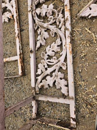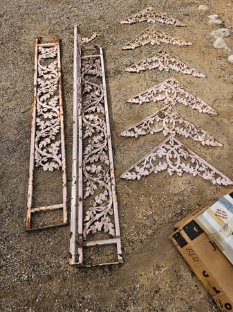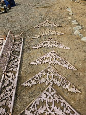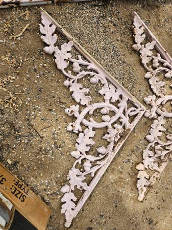 I have six Corner cast iron pieces they're acorns and leaves I have one Trestle that has a little damage but all super cool painted some stupid pink color but I think if they were cleaned up they'd be an awesome accent to any rustic home phone calls only 468-1337
