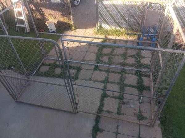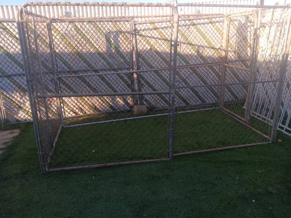 Chain link dog kennel, it is 10 ft long by 5 ft wide, 6 ft tall.