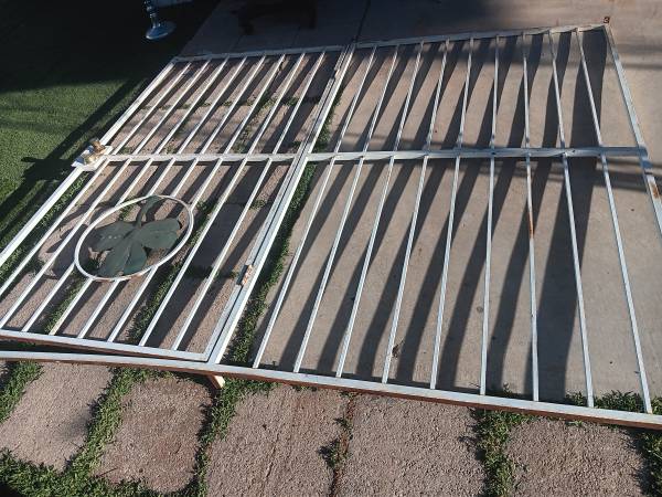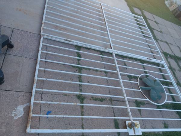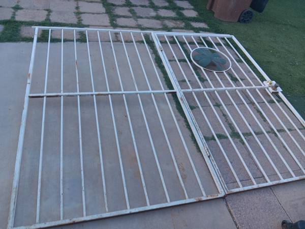 Large wrought iron security double door for sale. It is 99 inches wide by 85 inches tall. It has a cool clover design