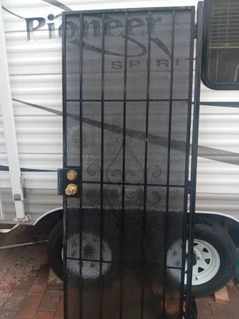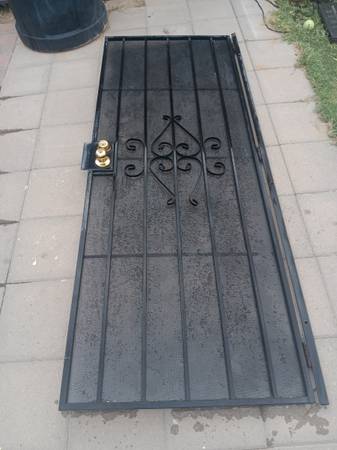 Metal screen door 80 inches tall, 30 inches wide. 31.5 inches wide including side post. It also comes with post that attaches to the wall. It has a small cut on mesh. $60 firm