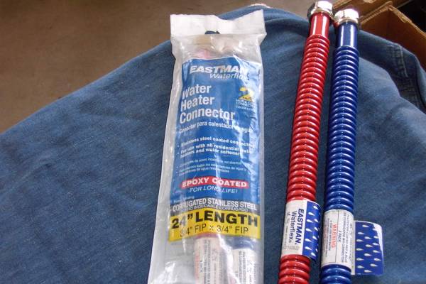 Stainless water heater flex connectors Stainless steel Water heater connectors Hot and cold pair. 3/4"fip x 3/4"fip. 24" long. The pair. $10.00 Call fivtozro 245-8933