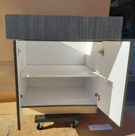 Grey, wood pattern, base cabinet. 30"W x 24 1/2" D x 34 3/4" H $40.00 cash only, must pick up. Text or call Al at (5 2 0) 4 6 5 - 5 5 5 9. No emails please.