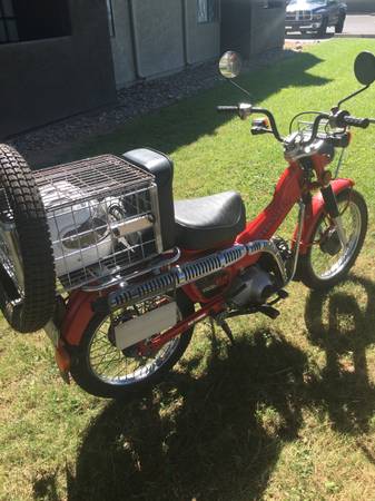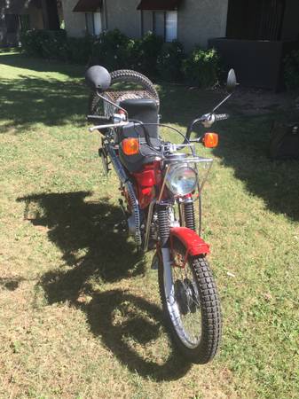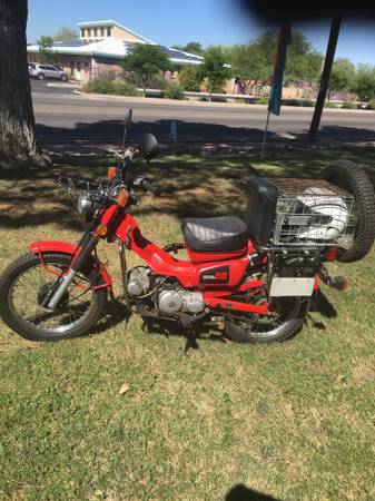 My dads old Honda Trail 100. 1473 miles. Time to let it go. Doesn’t turn but isn’t locked, just sat. Front/ rear shocks replaced with heavier capacity. Has the original spare tank. Tanks are rust free. Front cargo rack, rear bag rack, old metal milk crate for cargo, the top is from the bottom of another crate and can be used for bbq. Shoei helmet and a box of tubes, tools, unopened Motul oil ($50), spare parts. Bags are mine. Thanks for looking.