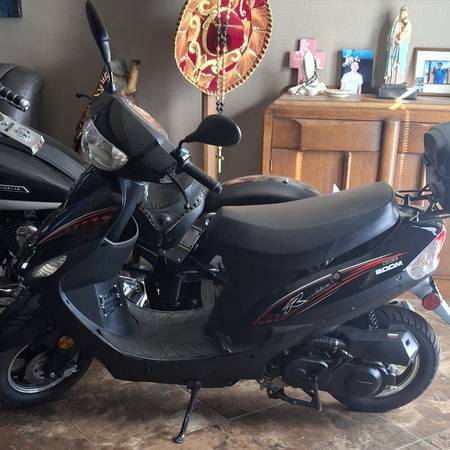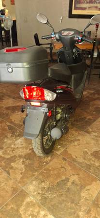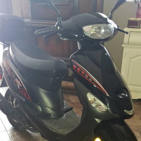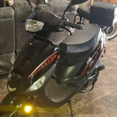 49cc.completely automatic, so can drive in bike lane or street, used by my daughter for a few months it's still like new in every way, street legal with plate and title, lights and blinkers all like new also has storage under seat and optional trunk/box. Steering locks with keys, always stored indoor. original cost with shipping and mvd. inspection plus all the paperwork to be street legal was about $1500. we're asking $850 its 100% ready to ride. call or text only please.