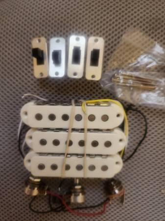 This is a complete set of three pickups from a Squier Bass VI, including the metal “claws”, 4 slide switches (one for each pickup and one for the “strangle” circuit), Volume and Tone Pots, mounting screws and mounting foam with springs. Faux tortoise pickguard. All in excellent condition, as new.