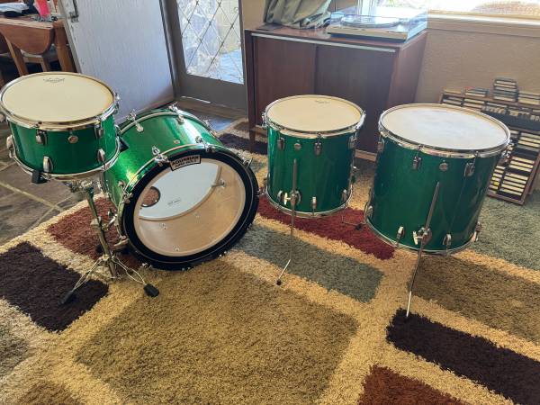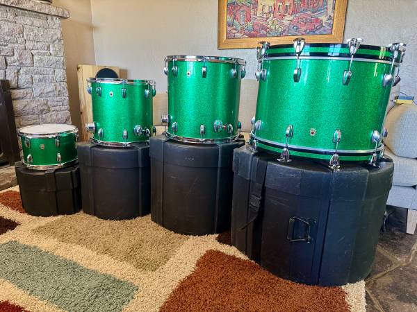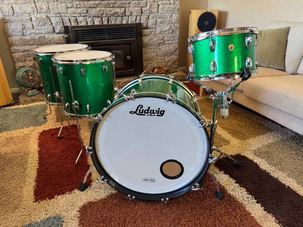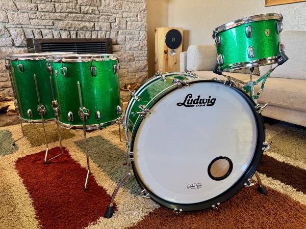 I got this kit a couple of years ago off of Reverb for a recording project and find that I’m really not using them as much as I should and they definitely should go to a new owner! This is Ludwig‘s flagship top-of-the-line, made in the USA Legacy Maple kit. They have been stored in their Humes & Berg Enduro Pro cases ever since I got them. They sound incredible as you would expect. They are basically a modern repressing of the vintage 60s three ply Ludwig drums that have dominated music for decades, the toms have internal mufflers and the bass drum is equipped with the classic telescoping spurs. These retail for over $4,500, the cases alone retail for over $700 so here’s a chance to grab an incredible deal! Here’s more information about these incredible drums…