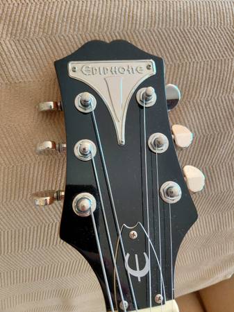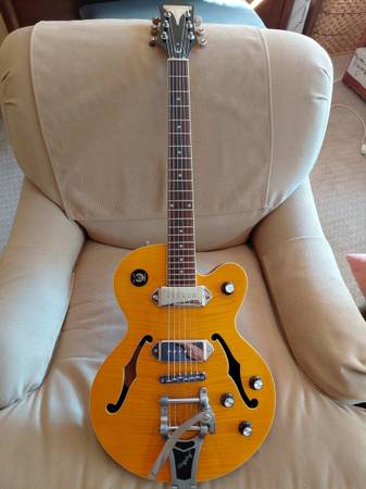 Used Epiphone Wildkat with Bigsby in eye-catching yellow finish, this hollow body electric guitar is in great condition. Features include a maple body, mahogany neck, rosewood fingerboard, dual P-90 pickups, Grover tuners, and a licensed Bigsby vibrato for smooth vintage-style tremolo. Epiphone's own Wildkat delivers rich, warm tone with classic rockabilly flair and modern reliability. Very clean with no scratches or dents to speak of. Set up with low action and flat wound strings. Includes Epiphone hard shell case in good condition. Smoke free home. Price firm.