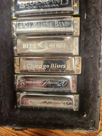 Good quality several + case. Lightly used Hohner marine band 12 holes $75 Lee Oscar natural minor Dm $50 Hohner special 20 A F D $75 Hohner blues harp MS. G F $35 Hohner marine band Bb C. $20...