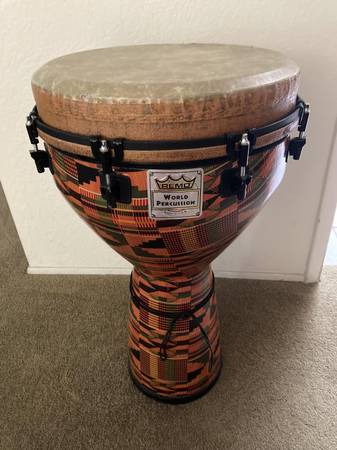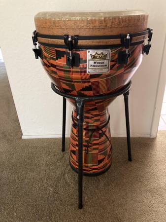The Remo Mondo Djembe is made of an Acousticon shell, and a durable synthetic Mondo Skyndeep drumhead, creating powerful, vibrant, high-quality tones, deep bass, and crisp slaps. 14" x 25”. Free metal stand. $185