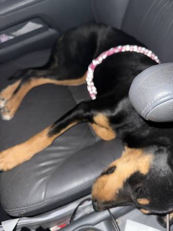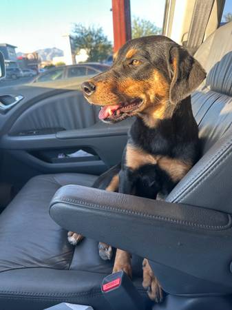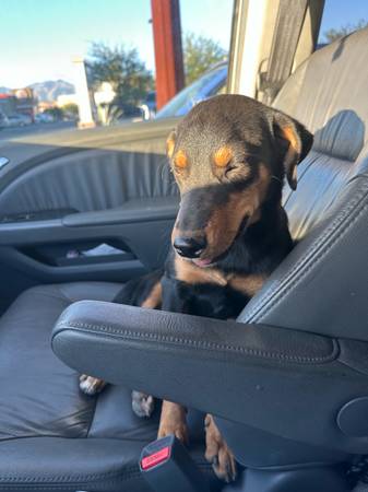 This precious baby needs a new home! She is a 6 month old Doberman mix. She has her vaccinations, a brand new microchip waiting for her forever family to update and register. And an appointment to get spayed at no cost to you! There is a rehoming fee! Just trying to break even on her. She is great with other dogs, and children of all ages. She doesn’t quite know how to walk on a leash but she’s working on it. Is WONDERFUL in a kennel. Sleeps in one throughout the night. She can use a doggy door. She was found outside our home skinny and malnourished, but has since gained some weight. She tries to go for the trash because I’m assuming for a large part of her life recently it was a great source of food! We are working on nipping that particular trait. She loves to help you clean up the floor if your children are messy eaters. She loves to snuggle and get belly rubs and scratches behind the ears. She does pretty dang good in/on car rides. She is a little skiddish at first but warms up fairly quickly. Please reach out if you’re interested. The sooner we find her forever family, the better! We are eastside Tucson!