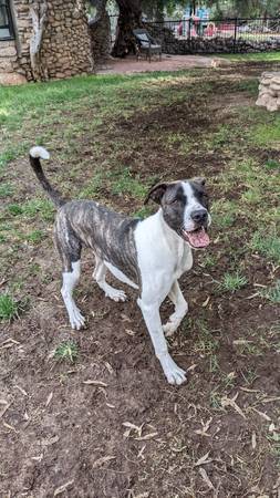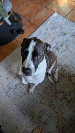 Huli - Beautiful brindle pit mix, needing a new home that can care for him. We have a toddler and another kid on the way, and cannot give him the love he needs. He is a loving dog to his owners but has a hard time meeting new people, and it makes it hard for us to have people visit. He is up to date with shots. He knows commands, listens well and very protective. Will give lots of toys, bedding and food.