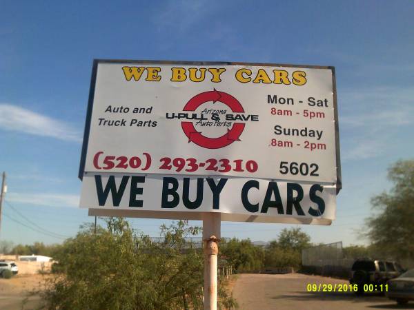 Entren a ver nuestra fila de autos para partes aqui en Arizona U Pull and Save. Estamos localizados en la area noroeste de Tucson, AZ. La yarda esta abierto los 7 días de la semana de Lunes a Sábado 8 a 5 de la tarde, y domingo de 8 a 2 de la tarde. Gracias por su negocio.