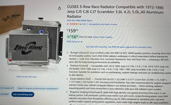 Bought this for my 86 CJ7 but wouldn't clear the fan clutch. Better suited for older CJ's without fan clutch or with electric fans.