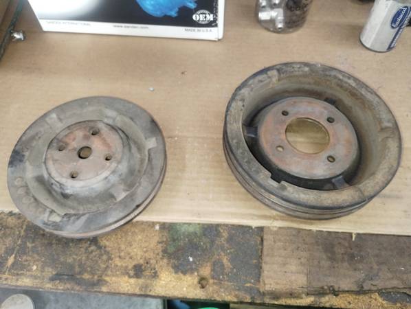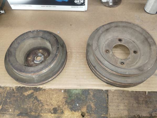 Water pump and crank pulley matched set from early 70s Cadillac. They look to be cast steel vs normal stamped steel pulleys. 3 groove crank, 2 groove water pump. OBO