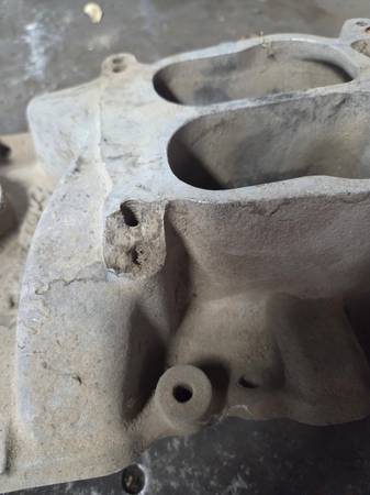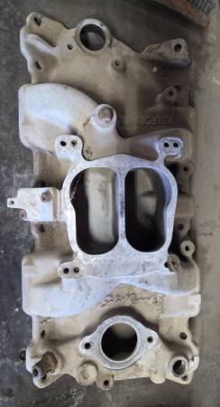 Edelbrock small block intake manifold for a Chevy engine, #2101, the carburetor boss is cracked but can be repaired. Please call or text me. Use of mail may cause a delayed response.