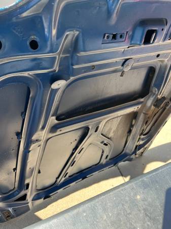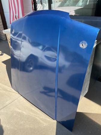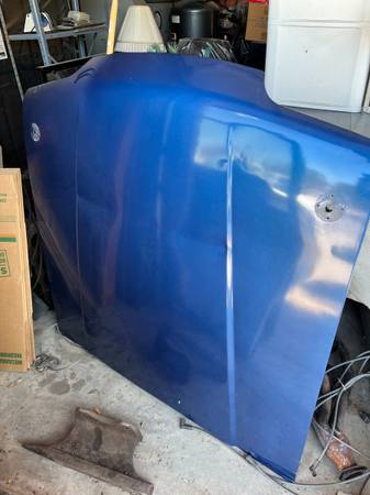 Stock steel hood that fits 1987-1993 Ford Mustang. Good shape with no rust, BUT, it is creased where it blew up and hit the top of the windshield frame. It also is drilled for hood pins, which I do have if you want them.