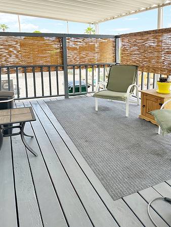 There's a roomy deck under the awning, allowing for shaded meals and entertainment outside. There are two large potted fruit-bearing trees out front, which is the only thing that needs to be watered and looked after.