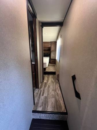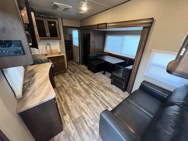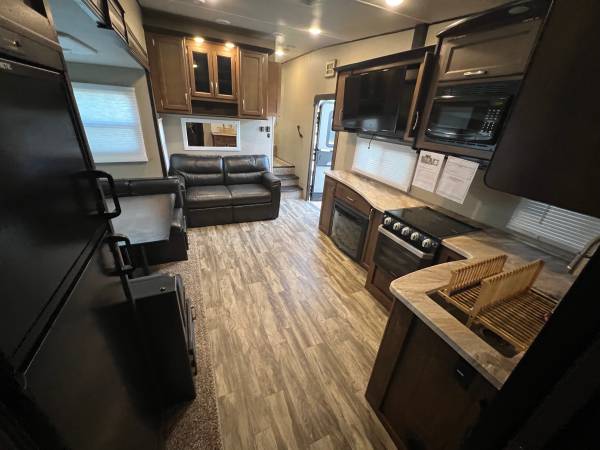 Come see this amazing fifth wheel fit for a large family of 9! This unique floor plan has a center living space and a large bunk room in the rear equipped with three bunks, large bathroom space and a front room with a queen size bed.